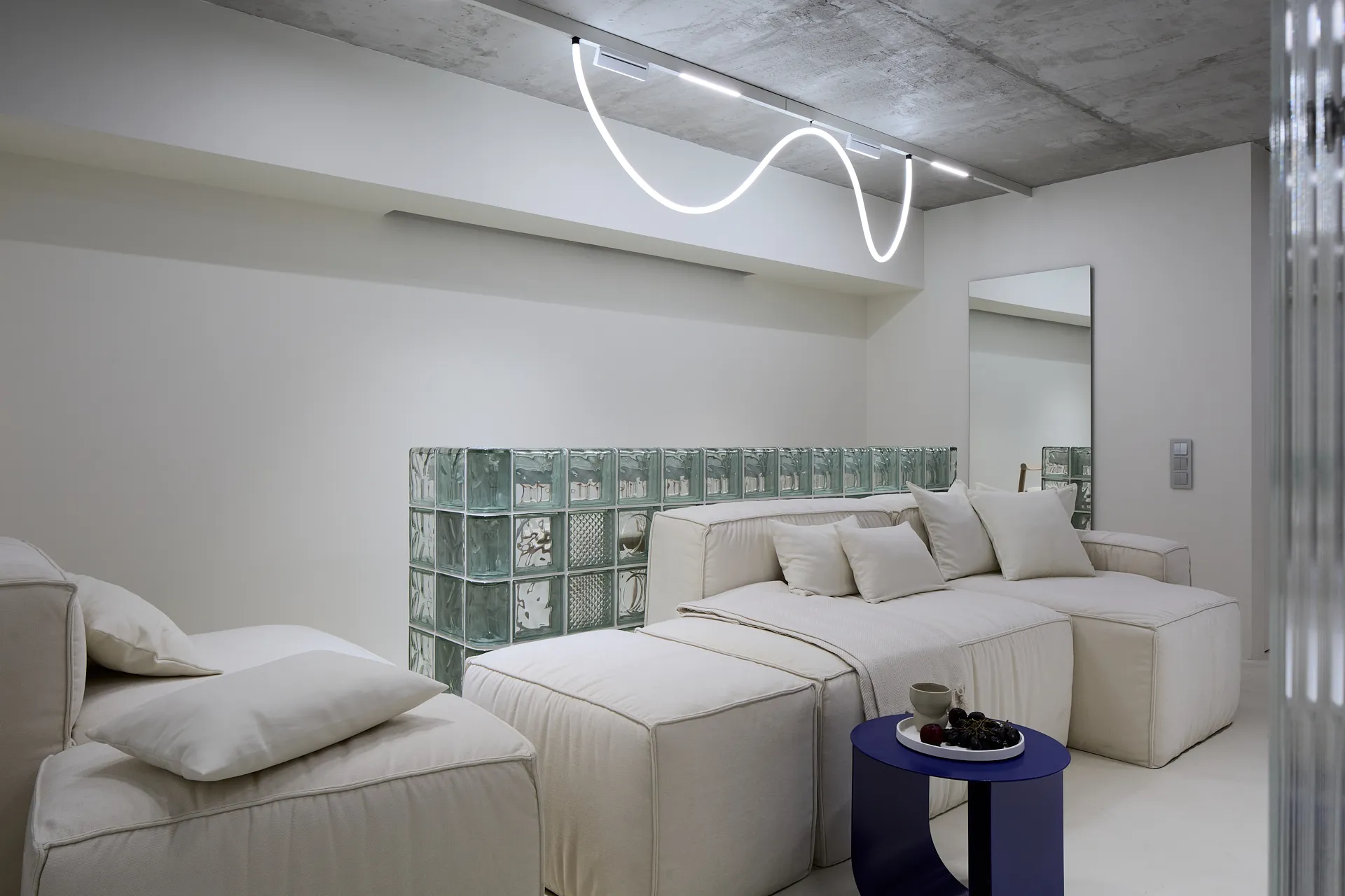 Интерьер выполнен в нейтральных светлых и теплых тонах, что делает его уютным и комфортным для родителей. В то же время яркая цветная мебель и многоцветная подсветка добавляют динамики, которые особенно оценит молодёжь. Особый шарм придаёт возможность кардинально изменять настроение комнаты: при включении неонового света и цветной подсветки барной стойки помещение превращается в современное пространство для активного отдыха. А при выключенной подсветке комната становится спокойной и «семейной», идеальной для уютных вечеров.
